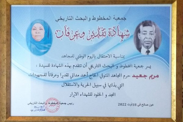 تكريم الحاجة مريم بنت ساعد بمناسبة اليوم الوطني للمجاهد، قام السيد مفتش التربية الوطنية لمادة التاريخ و رئيس جمعية المخطوط و البحث التاريخي بزيارة تكريمية للسيدة الحاجة مريم بنت ساعد حرم المجاهد المتوفي الحاج احمد مداني رحمه الله نظيرا لمجهوداتها اثناء الثورة في سبيل الحرية والإستقلال